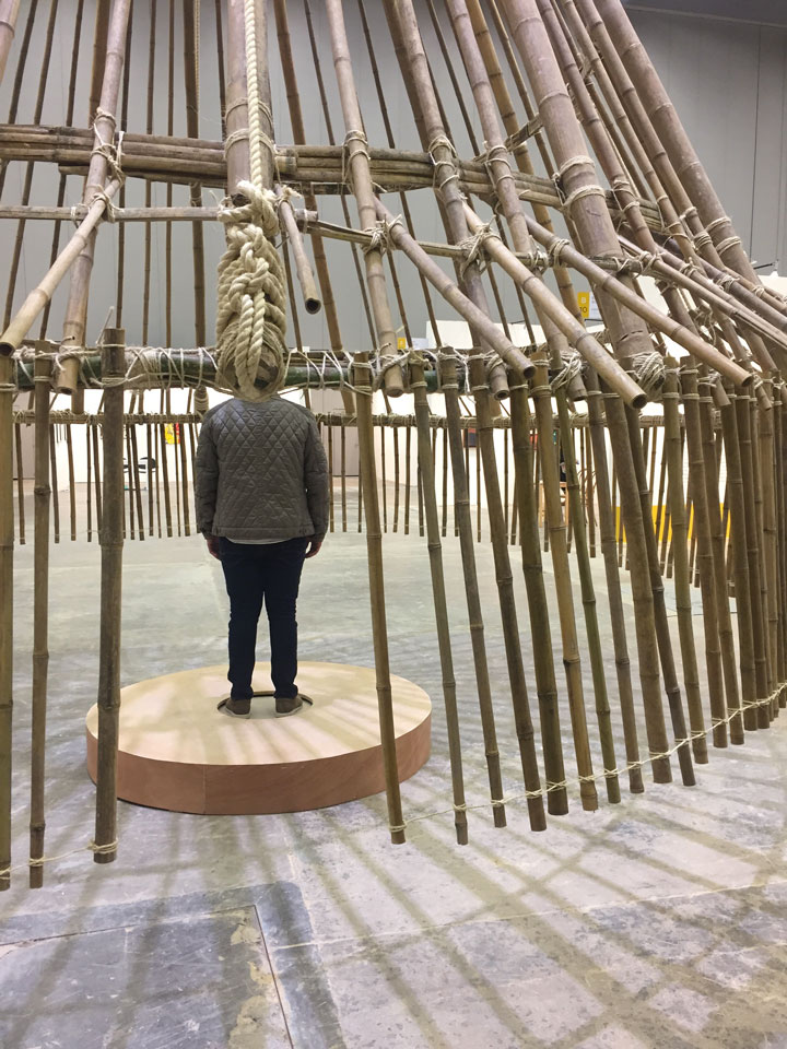 One of the outstanding works of the Sitio section was ‘Conic’ by the artist Tania Candiani. It welcomed visitors to ARTBO with a wood and fiber solid structure made with traditional methods of the ancestral Kogi architectural construction.