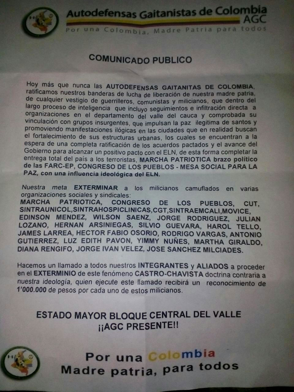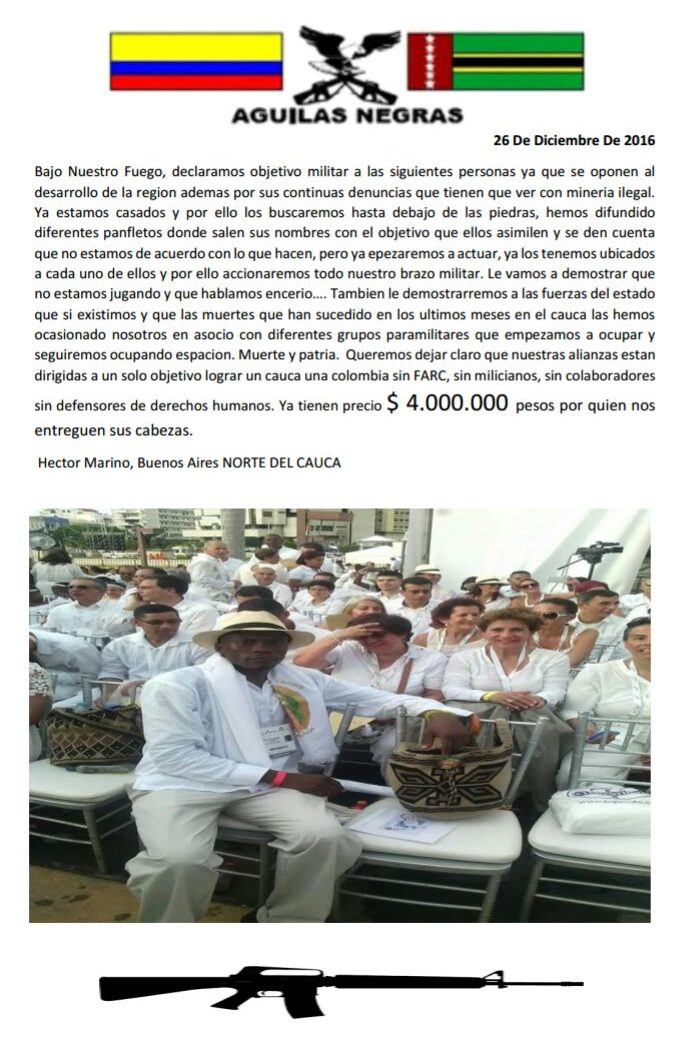 - The statement distributed by the Águilas Negras offering COP$4,000,000 reward for “the head” of social leaders in Cauca.