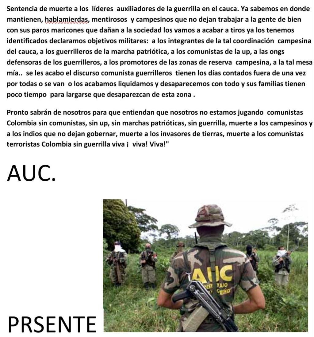 - Declaration from the supposedly demobilised paramilitary group, the AUC, declaring death to to anyone who opposes their ideology, from farmers to NGOs.