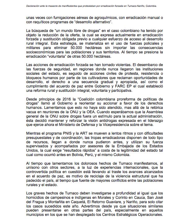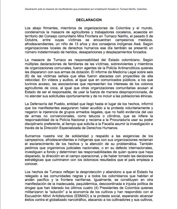 Joint statement from international organizations condemning government response to the Tumaco incident.