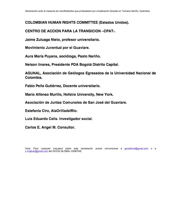 On October 9 deputy Attorney General María Paulina Riveros confirmed that the October 5 clash between armed forces and unarmed farmers in El Tamil, near Tumaco, had left a total of 6 confirmed deaths and 12 people injured.
